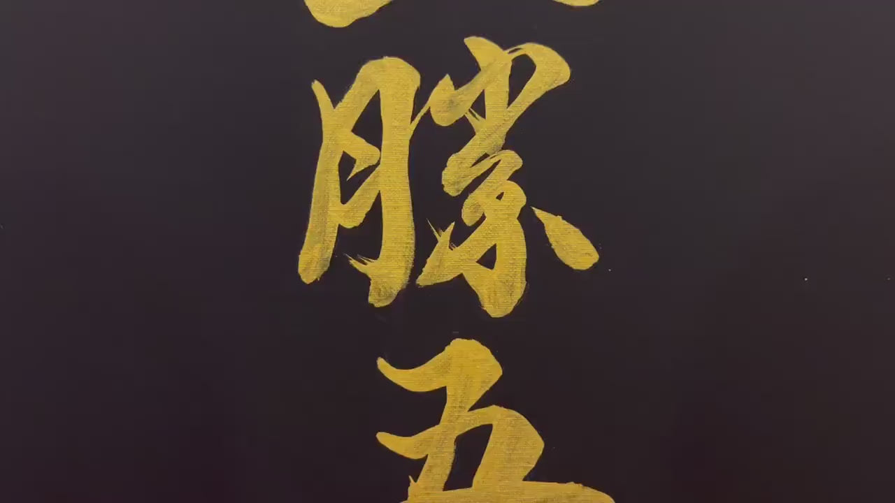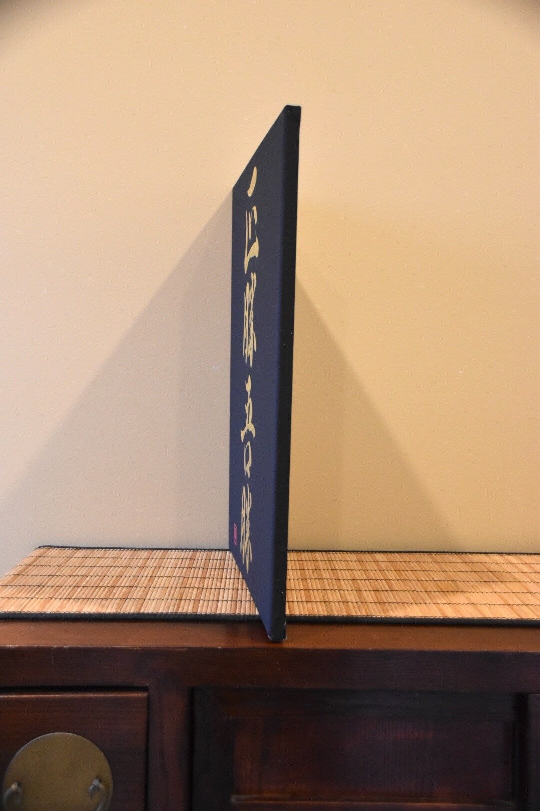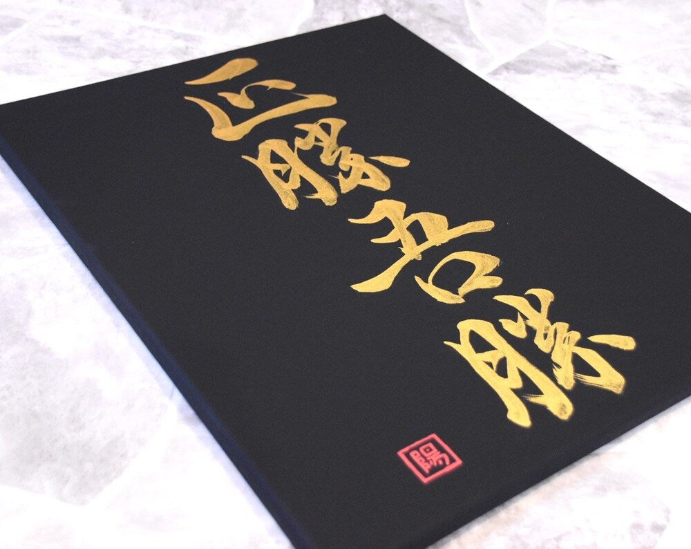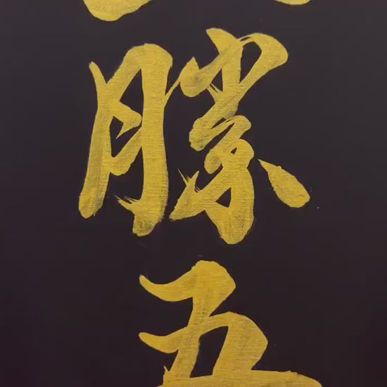 Japanese Shodo Calligraphy Art Black Canvas 正勝吾勝 Masakatsu Agatsu "True Victory is Victory Over Oneself" Hand Painted Gold Martial Arts Dojo