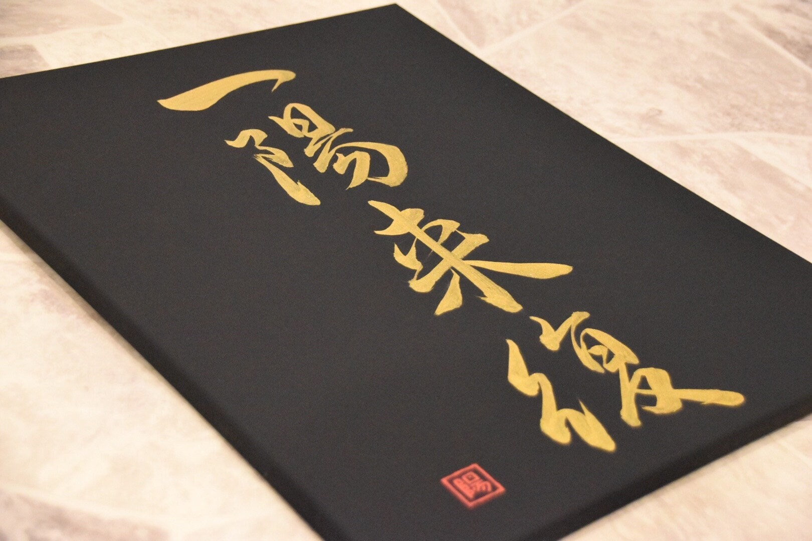 Japanese Shodo Calligraphy Art on Black Canvas 一陽来復 ICHIYO RAIFUKU Winter Solstice Hope Good Things Coming Hand Painted in Gold Gift Kanji