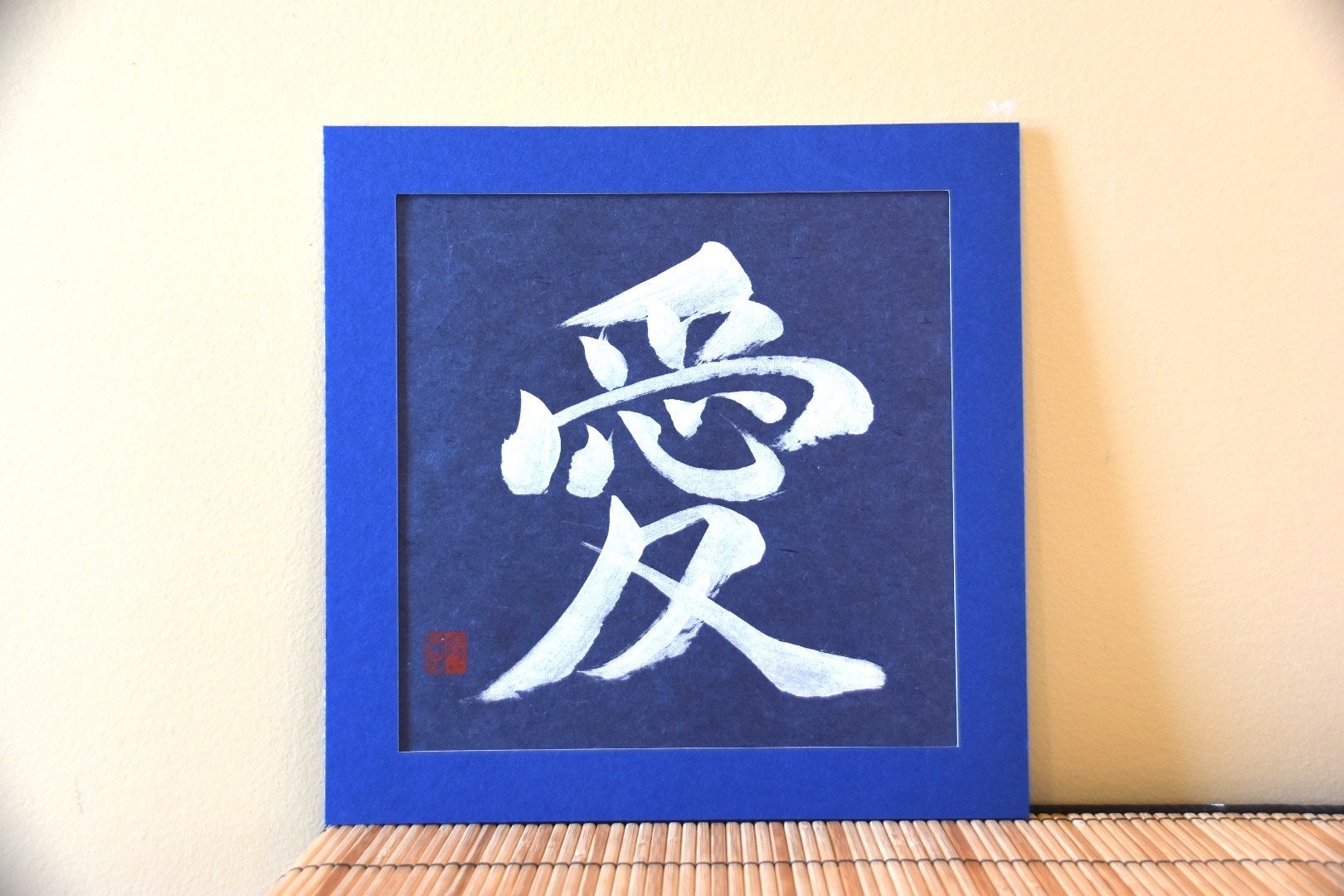 Japanese Shodo Calligraphy Framed Art 愛 AI LOVE Mat Board Navy Blue Paper Silver Ink Wedding Beautiful Gift Paper Anniversary Valentines