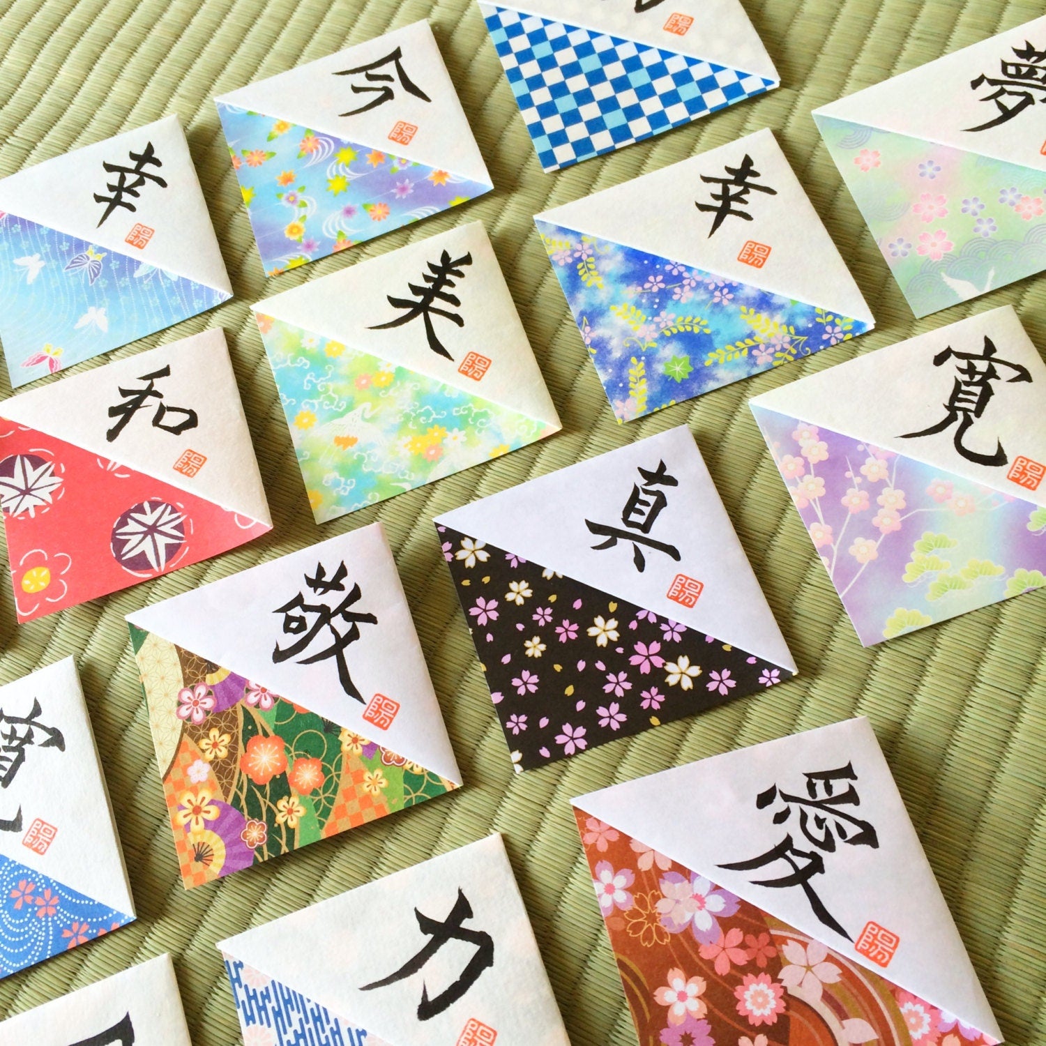 Set of 4 or Individual Unique Japanese Origami Bookmarks with Shodo Calligraphy Art Book lovers Martial Arts Wabi Sabi Washi Paper